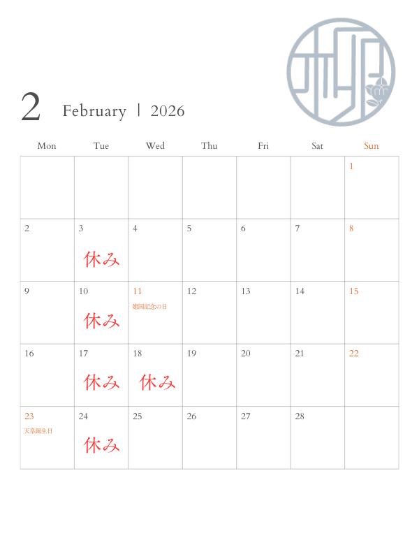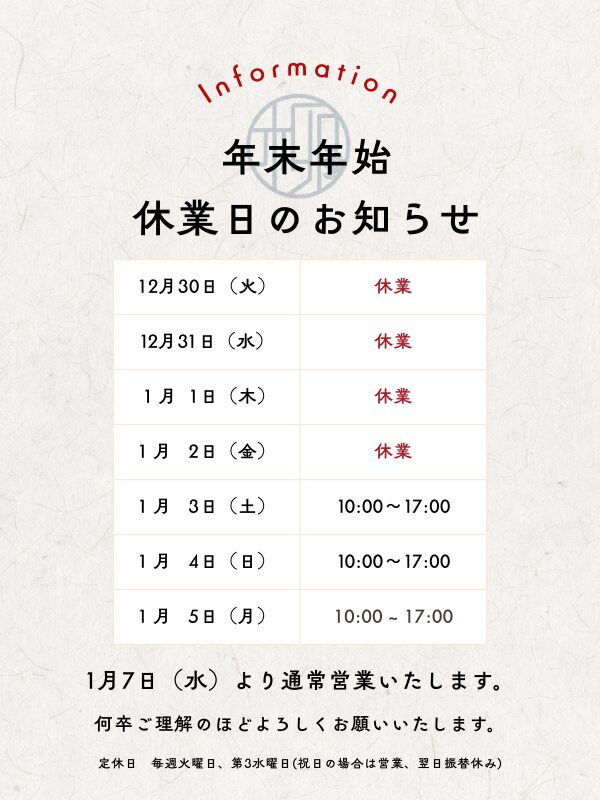 1月3日(土)、1月4日(日)、1月5日(月)は10:00~17:00迄の営業になります。